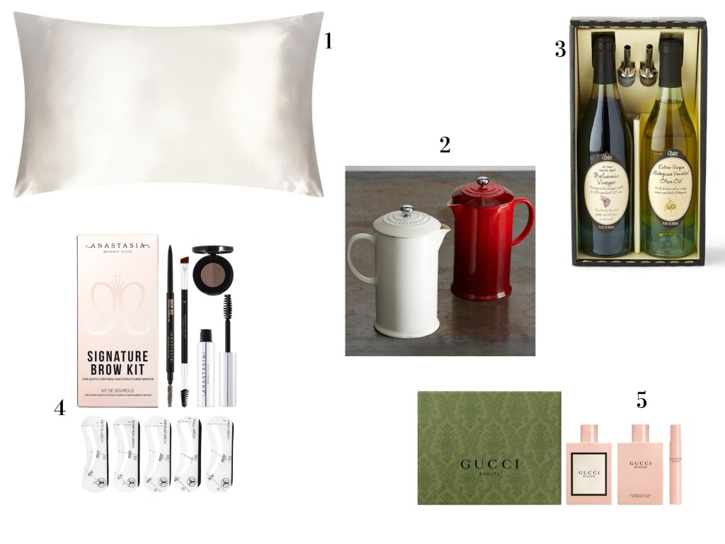 - Silk Pillowcase 2. Le Creuset French Press 3. Barrel Aged Balsamic Vinegar & Olive Oil 4. Anastasia Beverly Hills Brow Kit 5. Gucci Bloom Set