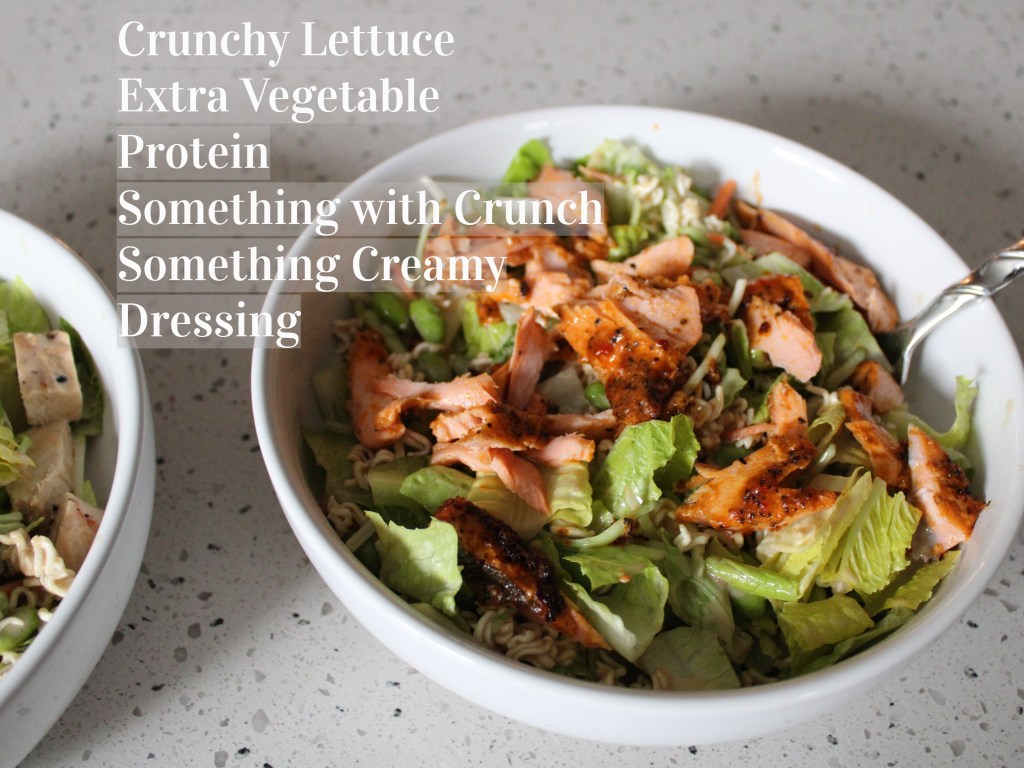 Like I said before, there is something about a crunch factor that makes a salad feel more filling and less boring to eat. This can come in many forms including croutons, a crunchy vegetable, or in this case I used dried ramens noodles.