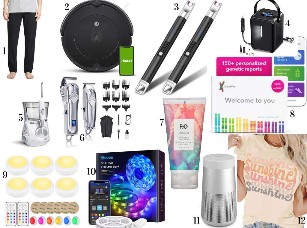 1. Men’s Lounge Pants 2. Robot Vacuum 3. Rechargeable Candle Lighter 4. Portable Air Compressor 5. Waterpik 6. Men’s Hair Clippers 7. Moisture & Shine Hair Cream 8. 23andMe Ancestry and Health 9. Puck Lights 10. Strip Lights 11. Bose Speaker 12. Sunshine Shirt