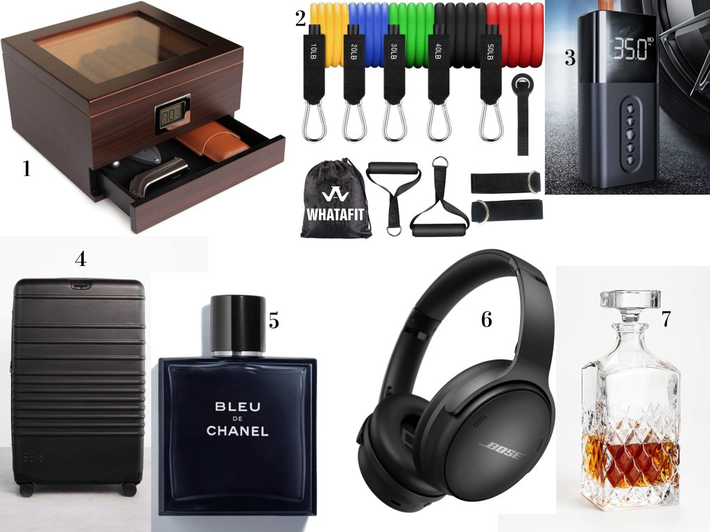 1. Cigar Humidor 2. Resistance Band Set 3. Portable Air Compressor 4. Checked Luggage Roller 5. Cologne 6. Noise Cancelling Headphones 7. Decanter