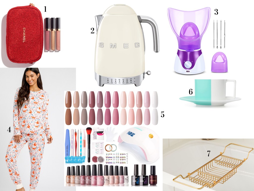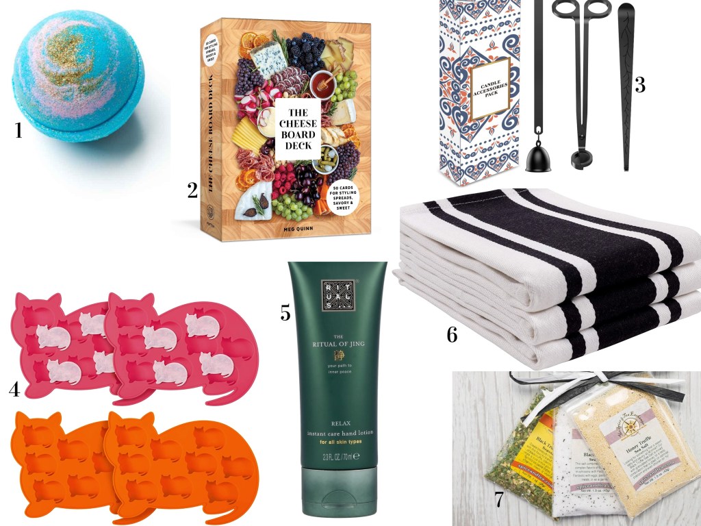 1. Bath Bomb 2. Cheese Board Deck 3.Candle Accessory Set 4. Novelty Ice Cube Tray 5. Hand Lotion 6. Dish Towels 7. Gourmet Spice Sampler