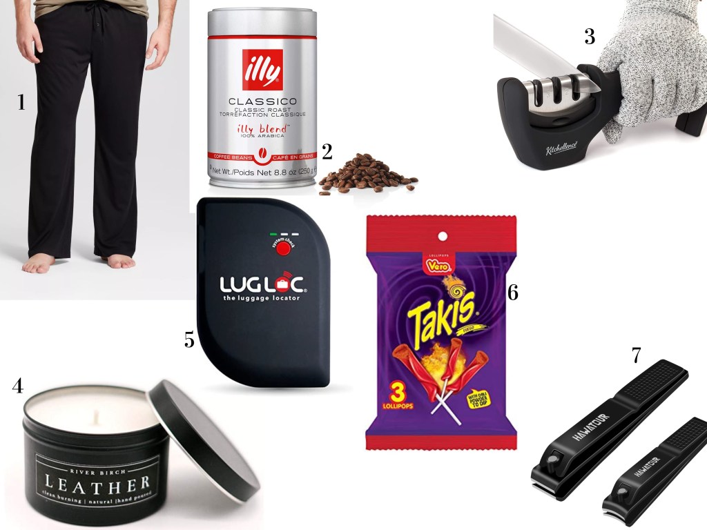 1. Pajama Pants 2. Coffee 3. Knife Sharpener 4. Leather Scented Candle 5. Luggage Tracker 6. Takis Lollipops 7. Nail Clippers