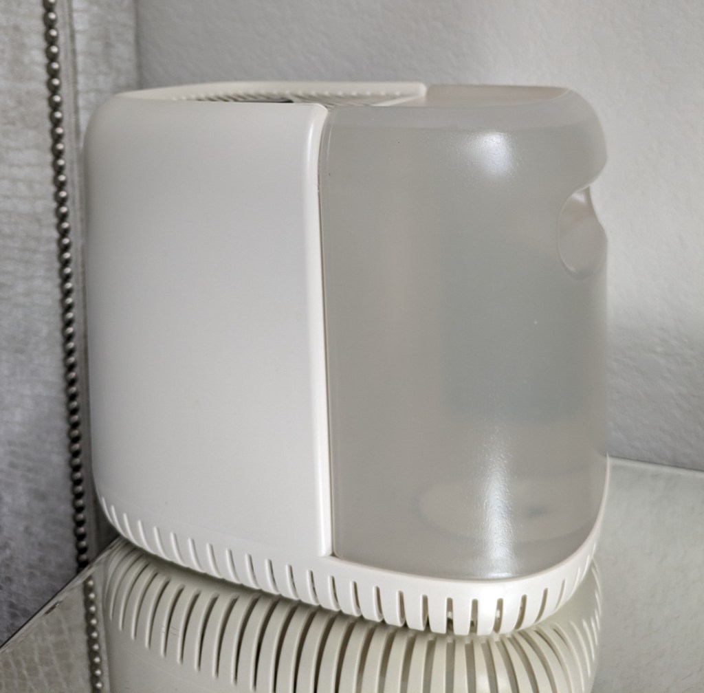 I could see the sound of this humidifier being off putting to some people. The bedside humidifier has three setting. The first setting is very quiet and I can’t imagine the sound would be bothersome to anyone. The second setting is a little louder but it doesn’t seem too loud to sleep with it on (I keep mine on the second setting). The third setting is what my husband refers to as “the jet engine” because it is extremely loud.